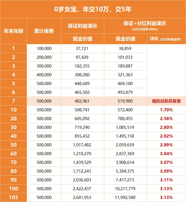 孩子7岁时,预期总利益回正,10岁时保证部分现价也回正。