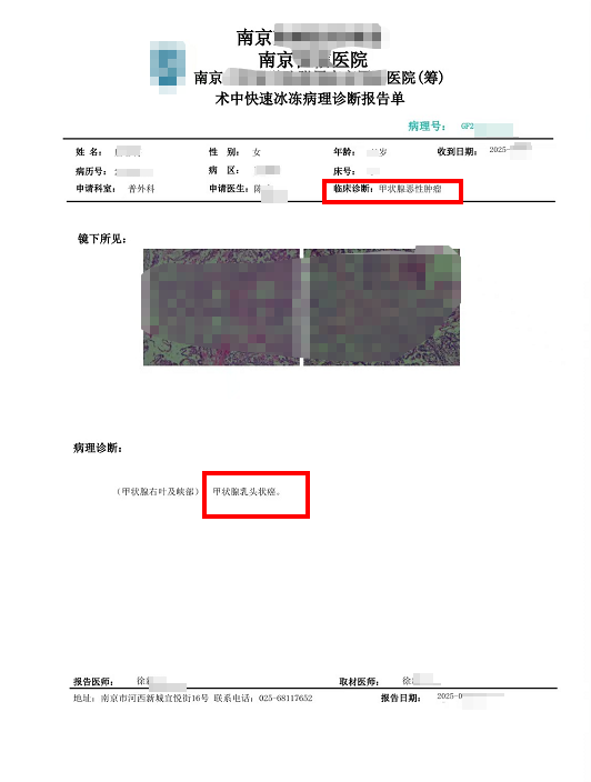 2025年4月18日,唐女士于江苏南京当地医院的穿刺结果显示甲状腺右叶结节”(波基)V类:考虑为甲状腺乳头状癌。