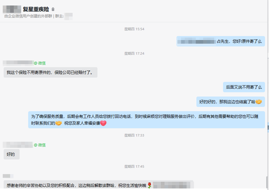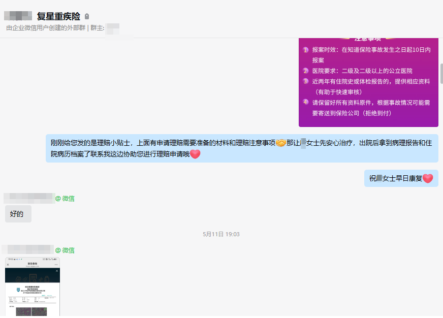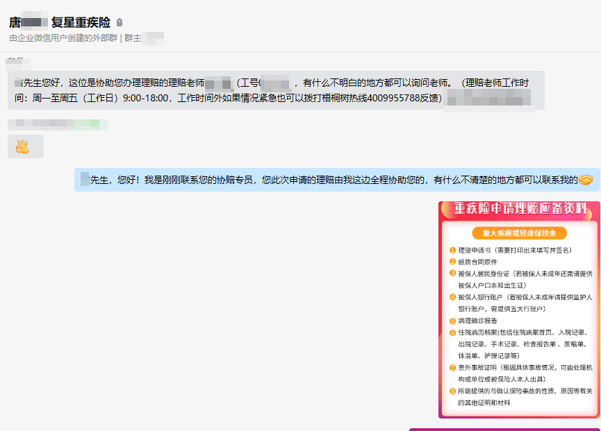 占先生于第一时间向梧桐树保险经纪专属客服报案, 我们协赔专员第一时间联系客户告知需要准备的理赔资料,在我们理赔客服的协助下,客户的理赔资料准备齐全,梧桐树保险经纪协助理赔团队协助客户完成理赔资料的准备工作。