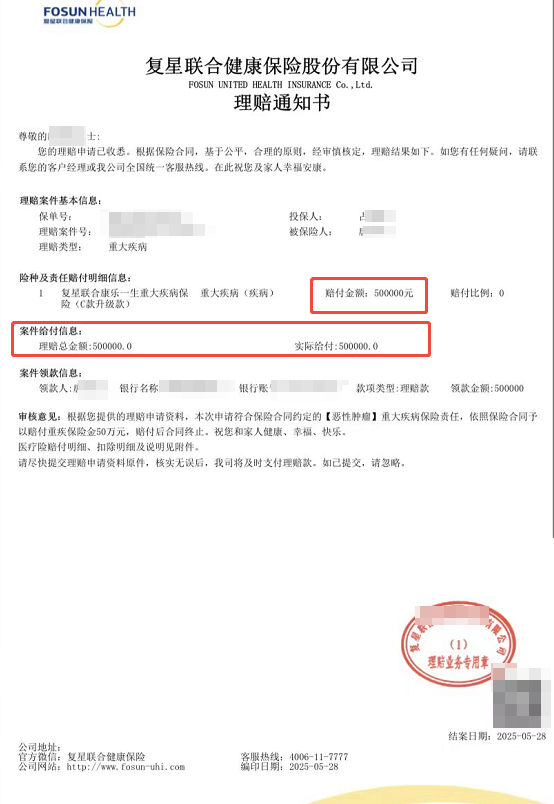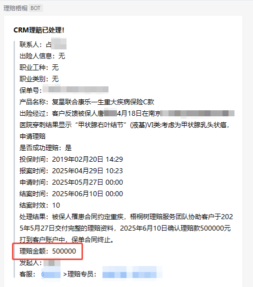 2025年6月10日客户告知收到理赔款500000元,并对梧桐树的服务表示感谢。