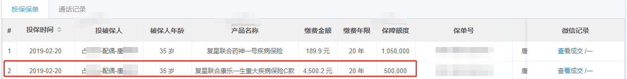 2019年2月20日,江苏省南京市的占先生为自己爱人唐女士配置了一份保额50万,交20年,每年保费4500.2元的复星联合康乐一生重大疾病保险C款。