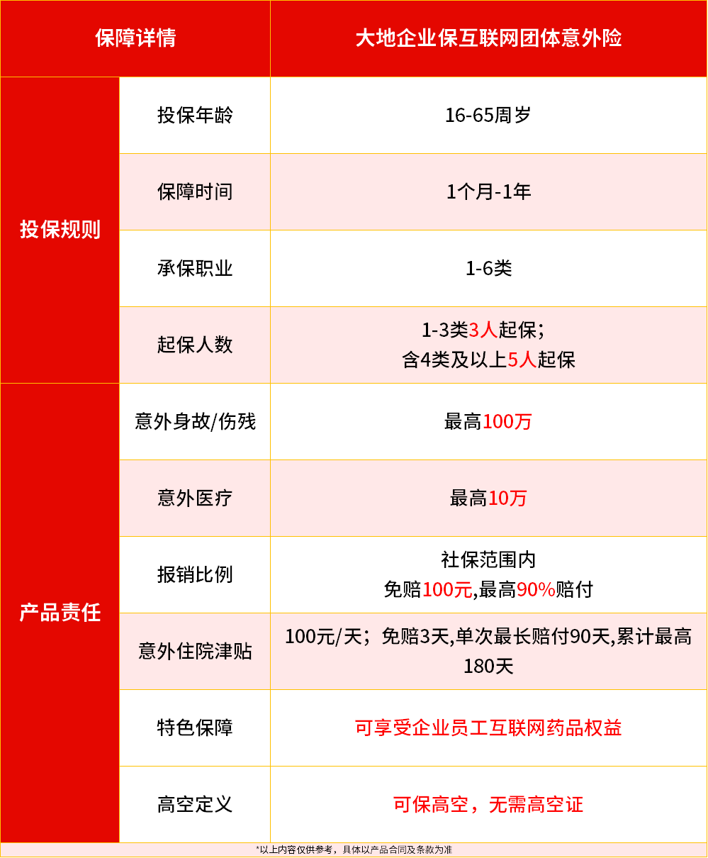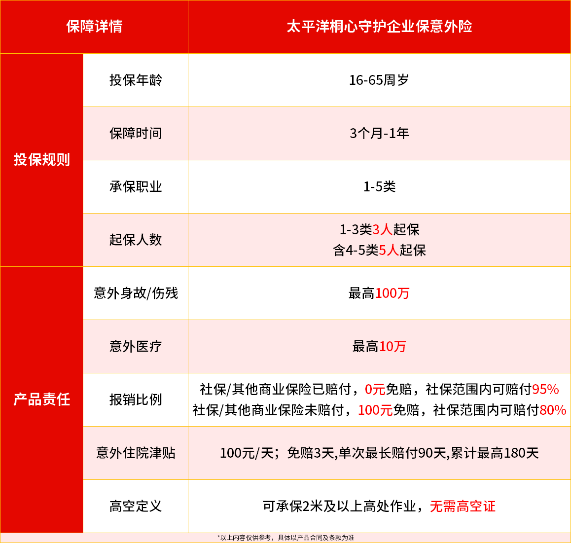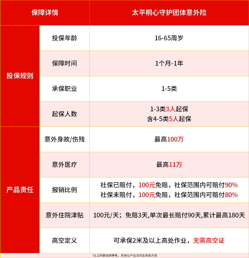 3-5人可起保;可保1-5类职业;意外身故/伤残最高可保100万;意外医疗可0免赔,最高可赔付95%;保高空,可免高空证;可保钢结构安装工、钢筋工、架子工等;可保劳务用工;保全天24小时意外风险,不管是否工伤。
