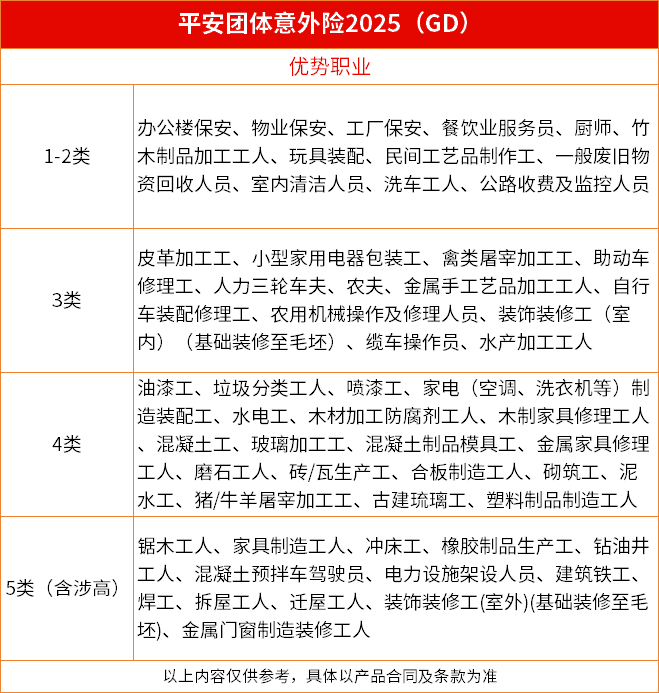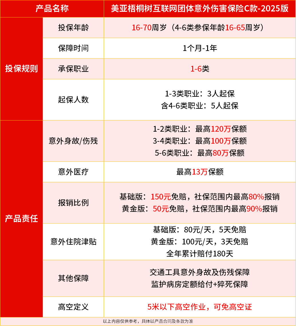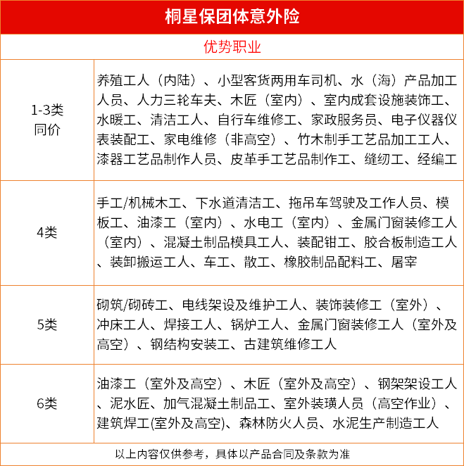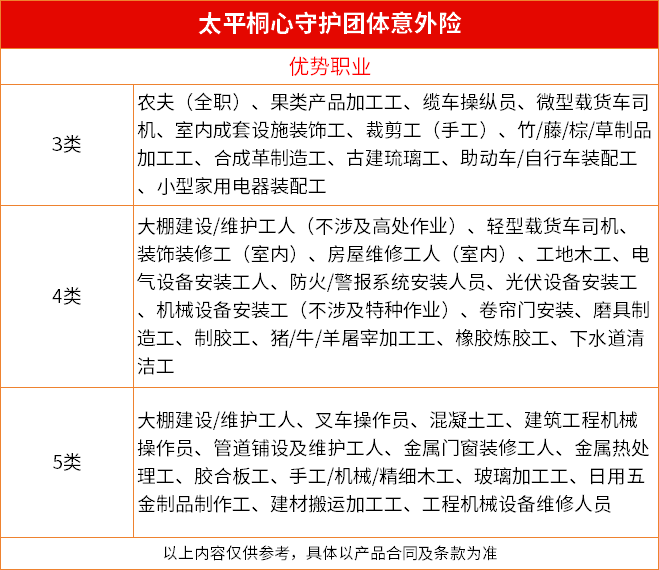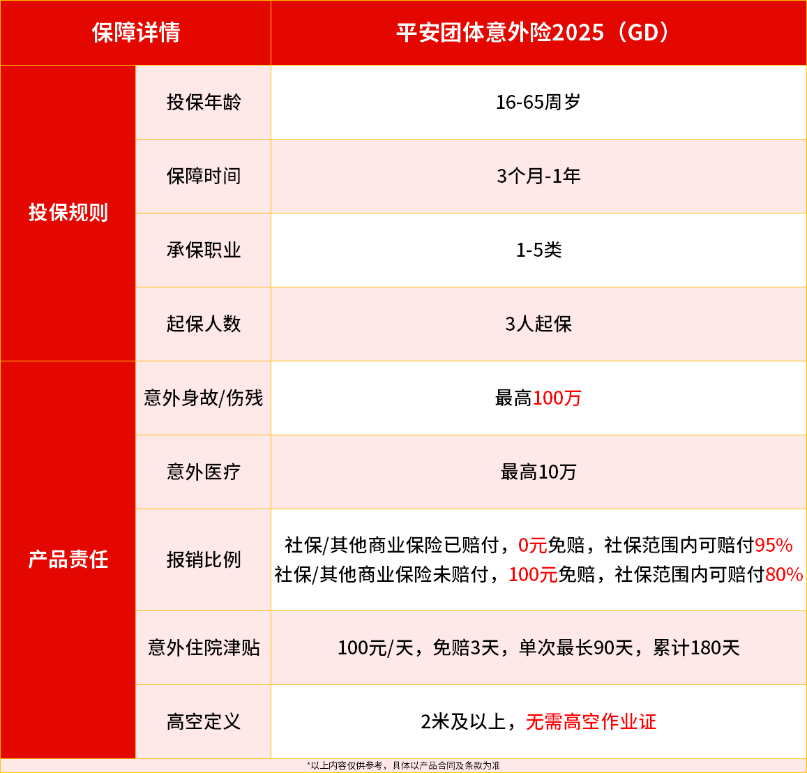 3-5人可起保;可保1-5类职业;意外身故/伤残最高可保100万;意外医疗可0免赔,最高可赔付95%;保高空,可免高空证;可保钢结构安装工、钢筋工、架子工等;可保劳务用工;保全天24小时意外风险,不管是否工伤。