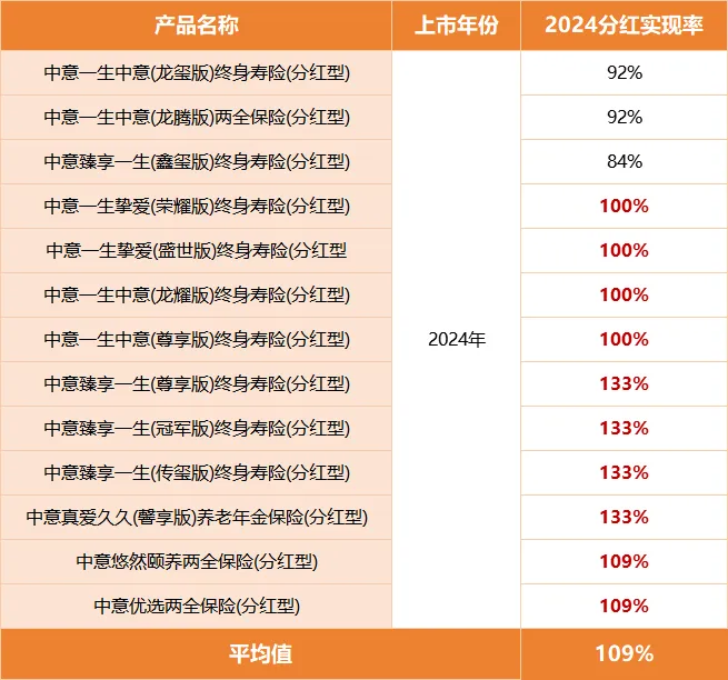 其中2024年上市的新品,平均分红实现率达到109%,大家熟悉的一生中意(尊享版)分红100%实现,客户收益率为3.4%,8.31前上车的朋友们大可以安心。