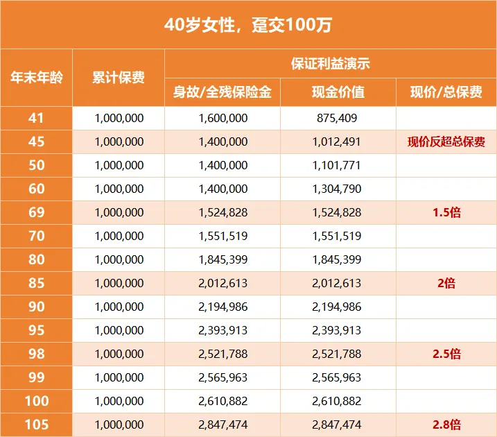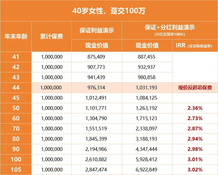 我们以40岁女性趸交保费100万为例,分别看下保证利益和含红利的预期总利益。