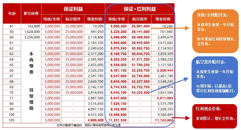 假如王先生105周岁时自然老去,那么这份保单的红利价值最高可达1112.49万,无需继承公证,百分百遵从投保人的意志,按约定的比例直接给付给到受益人,顺顺利利传承、没有税额顾虑。