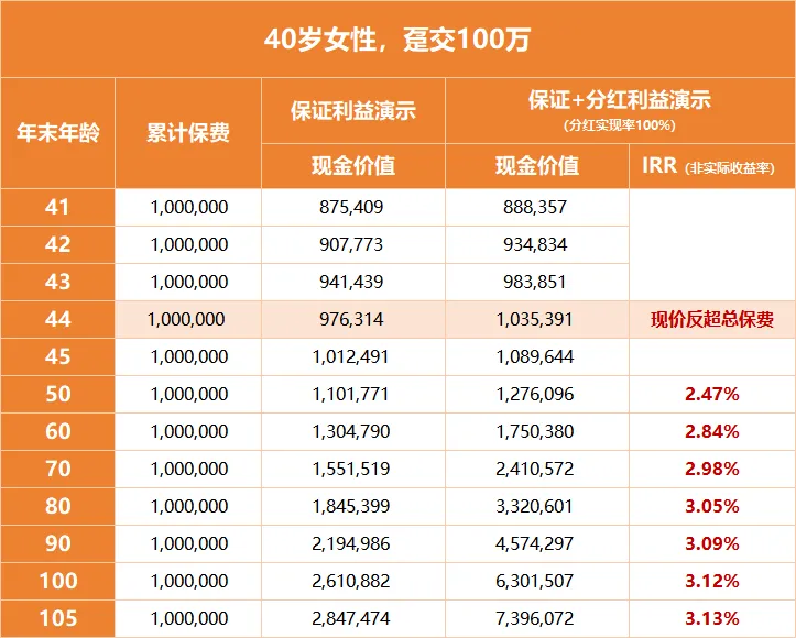 满打满算活到105岁时,预期总利益超739万,IRR突破3.1%。
