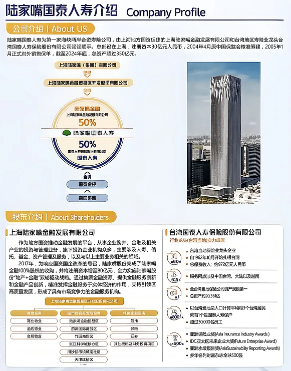 成立于2005年,由上海陆家嘴金融发展有限公司和台湾国泰人寿保险股份有限公司共同发起,双方各持股50%,注册资本30亿元。